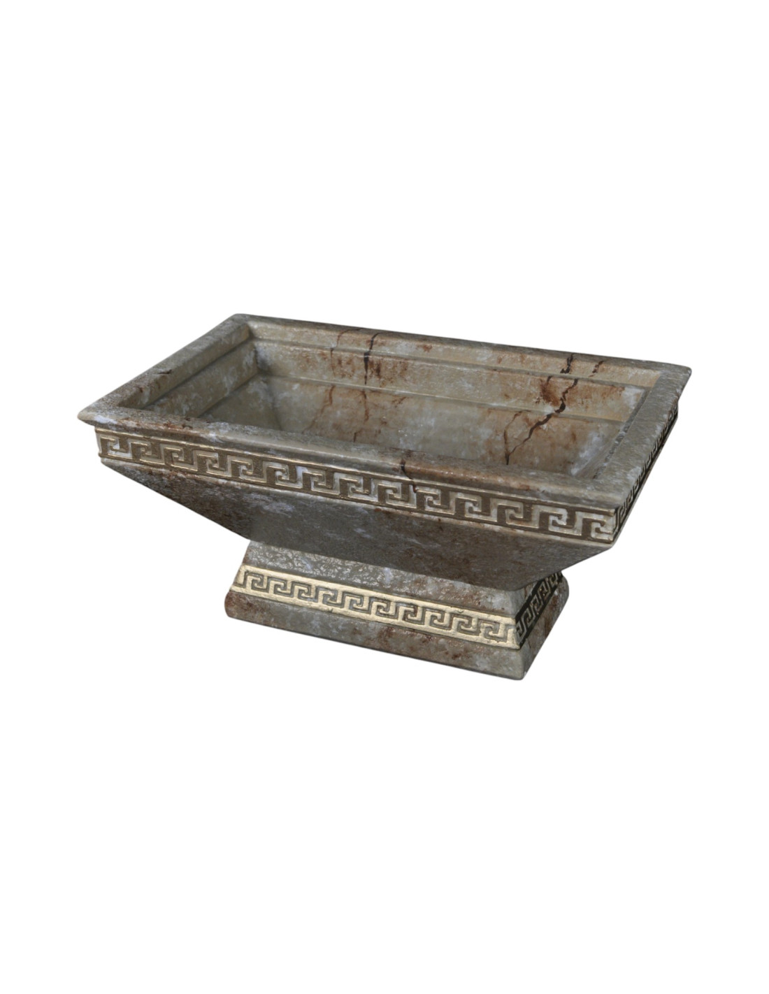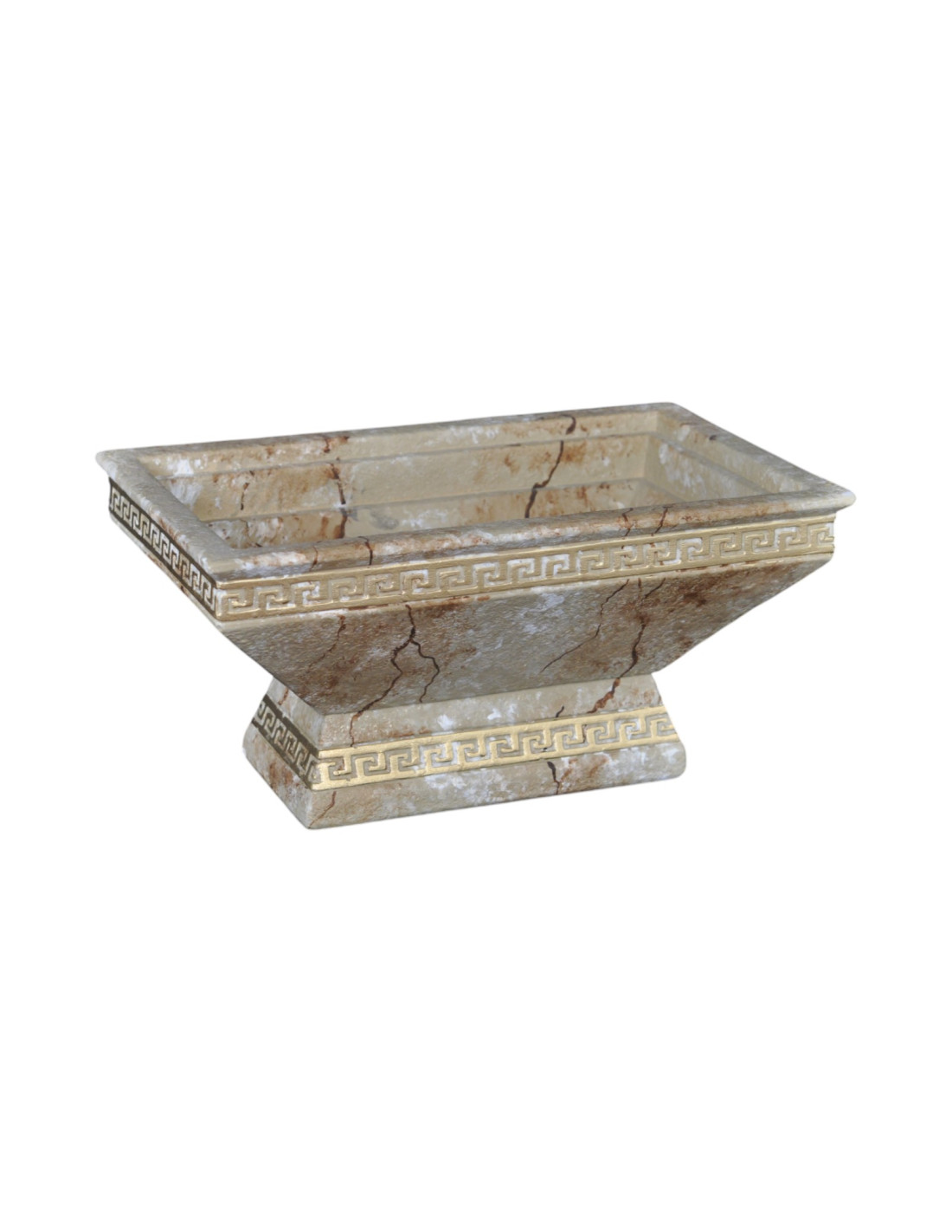 Ta klasyczna waza prostokątna łączy w sobie antyczny urok i współczesną elegancję. Inspirowana grecką estetyką, doskonale oddaje ponadczasowy styl, który podkreśla marmurowa kolorystyka wzbogacona złotymi detalami. Dzięki starannie odwzorowanym wzorom w stylu meandrowym na podstawie, idealnie komponuje się zarówno z klasycznymi, jak i nowoczesnymi wnętrzami.