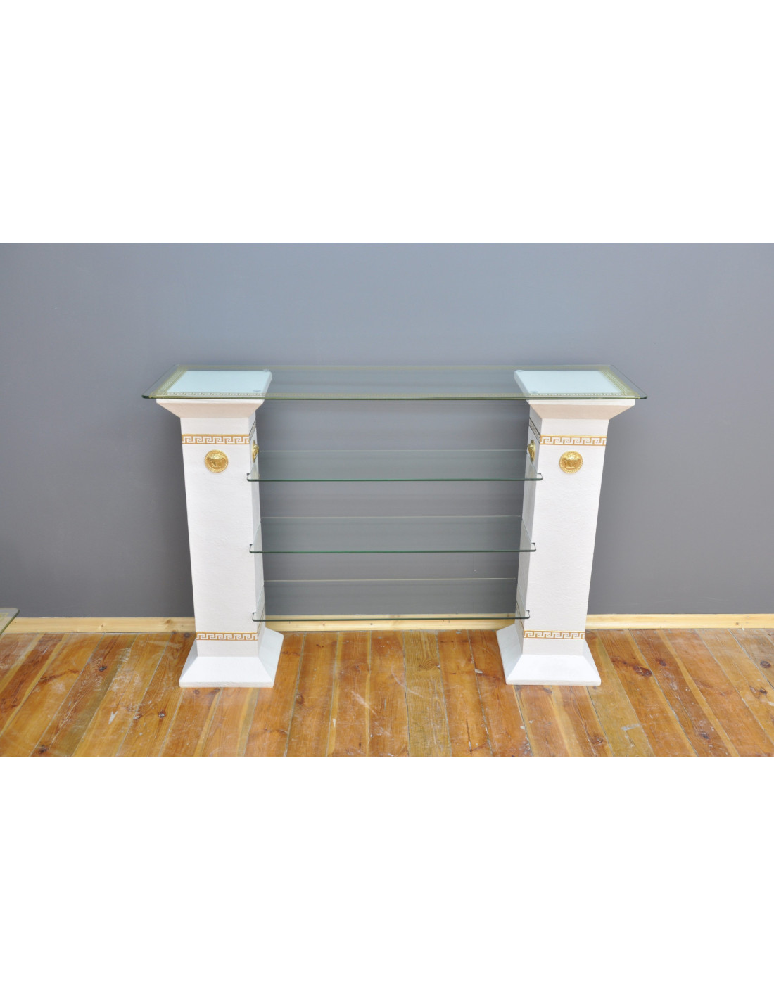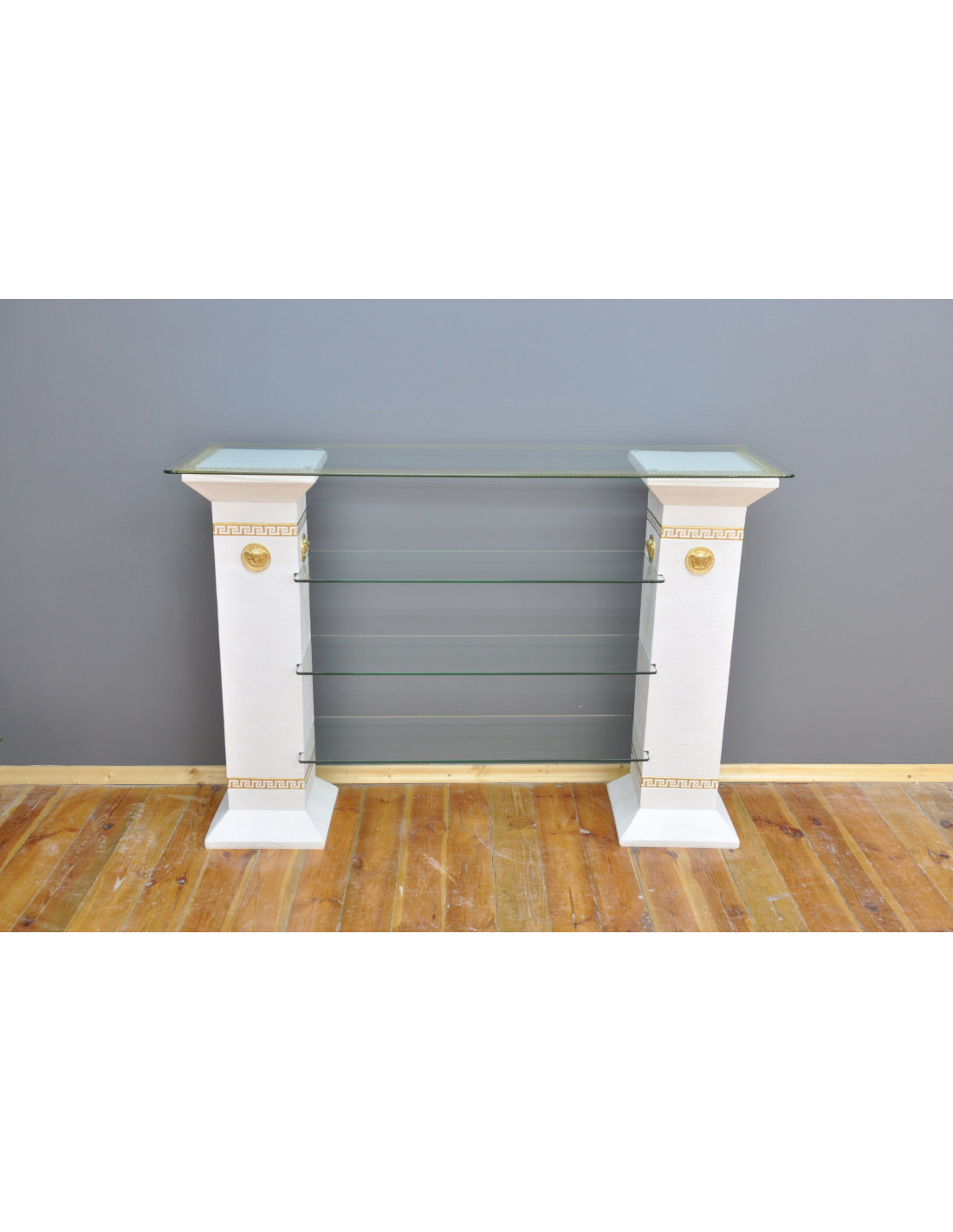 Stylowa konsola biała z kolumnami szklane półki styl grecki regał, H: 1,01 m