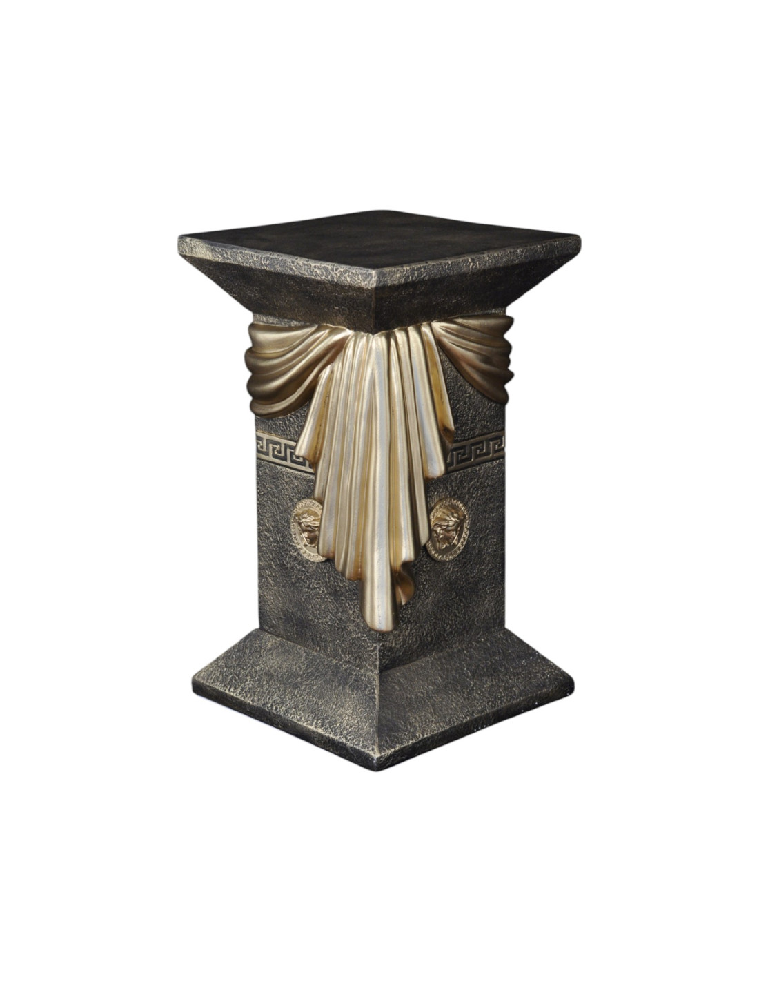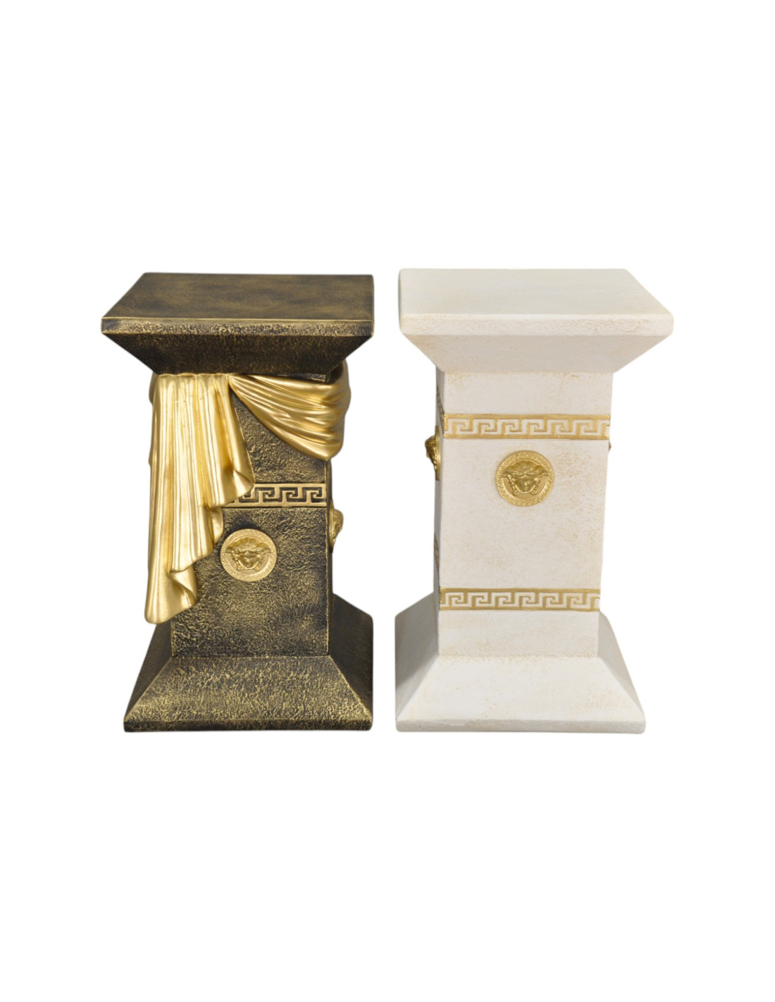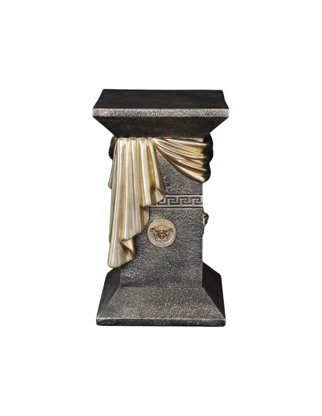 Kolumna zachwyca wyrafinowanymi detalami – elegancką draperią w formie szarfy oraz ozdobnymi medalionami inspirowanymi antycznym wzornictwem. Grecki ornament podkreśla jej klasyczny styl, sprawiając, że doskonale wpisuje się w eleganckie i luksusowe aranżacje. Jest doskonałym elementem dekoracyjnym – może pełnić funkcję stylowej podstawy pod rzeźby, wazony czy ekskluzywne dodatki. Świetnie sprawdzi się zarówno w salonach urządzonych w stylu glamour, jak i w ekskluzywnych wnętrzach barowych czy restauracyjnych.