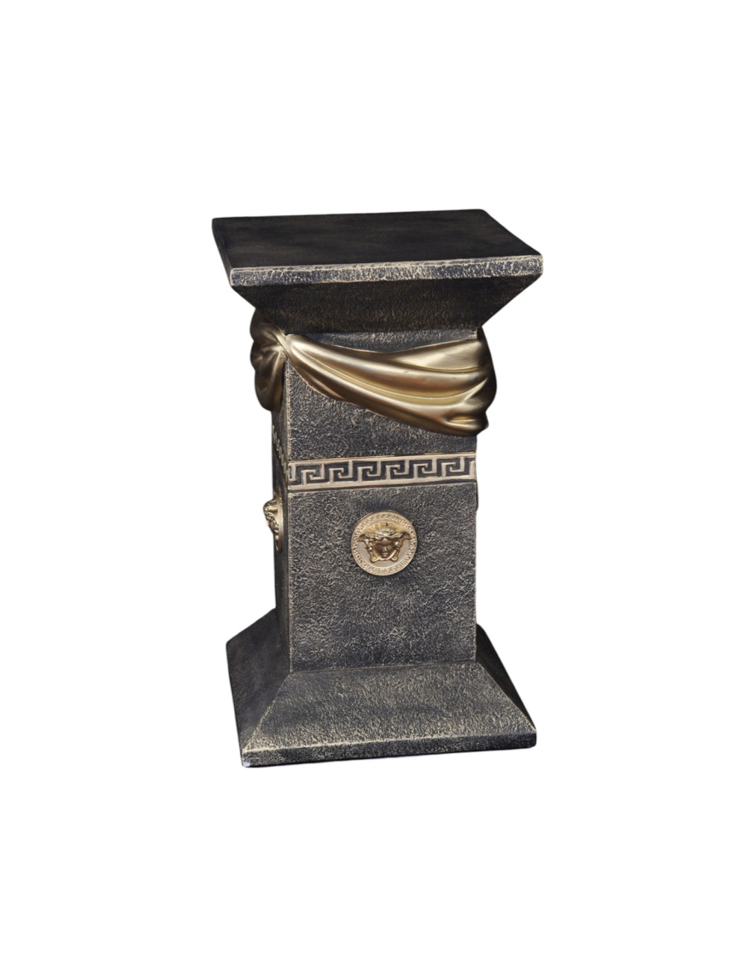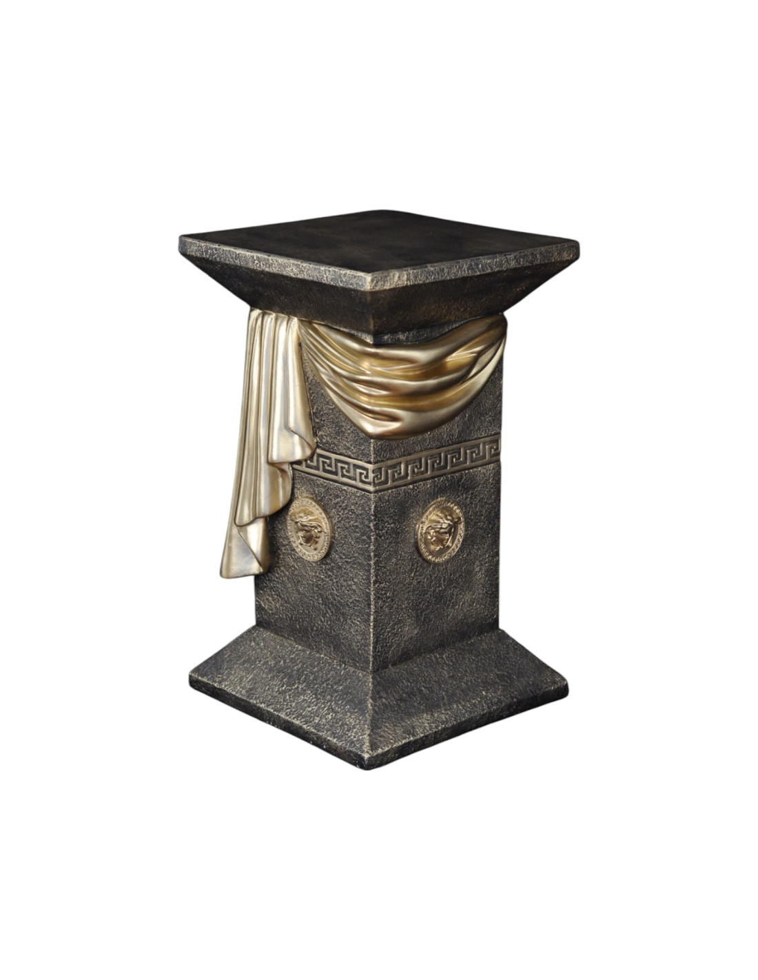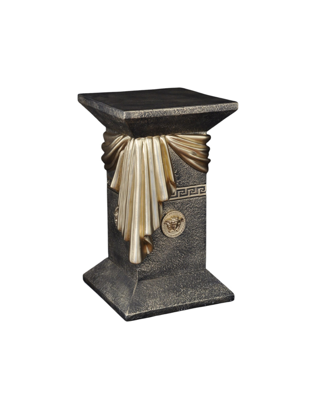 Kolumna zachwyca wyrafinowanymi detalami – elegancką draperią w formie szarfy oraz ozdobnymi medalionami inspirowanymi antycznym wzornictwem. Grecki ornament podkreśla jej klasyczny styl, sprawiając, że doskonale wpisuje się w eleganckie i luksusowe aranżacje. Jest doskonałym elementem dekoracyjnym – może pełnić funkcję stylowej podstawy pod rzeźby, wazony czy ekskluzywne dodatki. Świetnie sprawdzi się zarówno w salonach urządzonych w stylu glamour, jak i w ekskluzywnych wnętrzach barowych czy restauracyjnych.