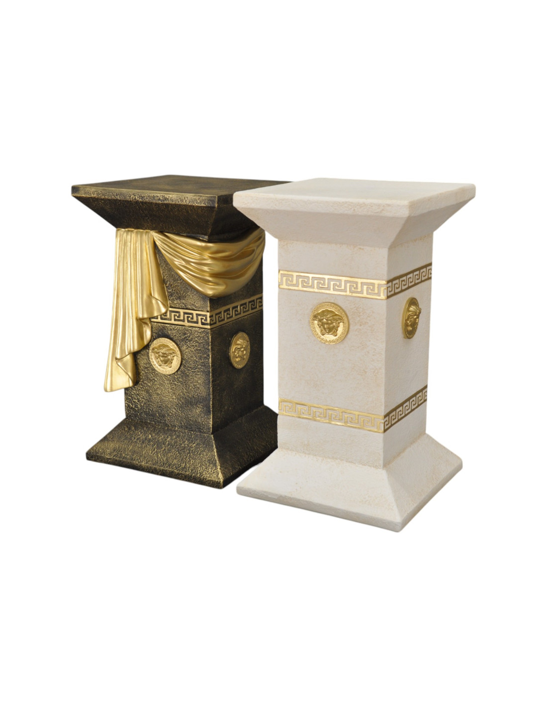 Kolumna ozdobiona jest efektowną złotą szarfą, której subtelnie drapowana faktura nadaje jej realistycznego wyglądu. Dodatkowe złote talary umieszczone na powierzchni kolumny w połączeniu z greckimi ornamentami tworzą harmonijną całość, idealnie komponującą się z wnętrzami w stylu klasycznym, glamour czy art déco.