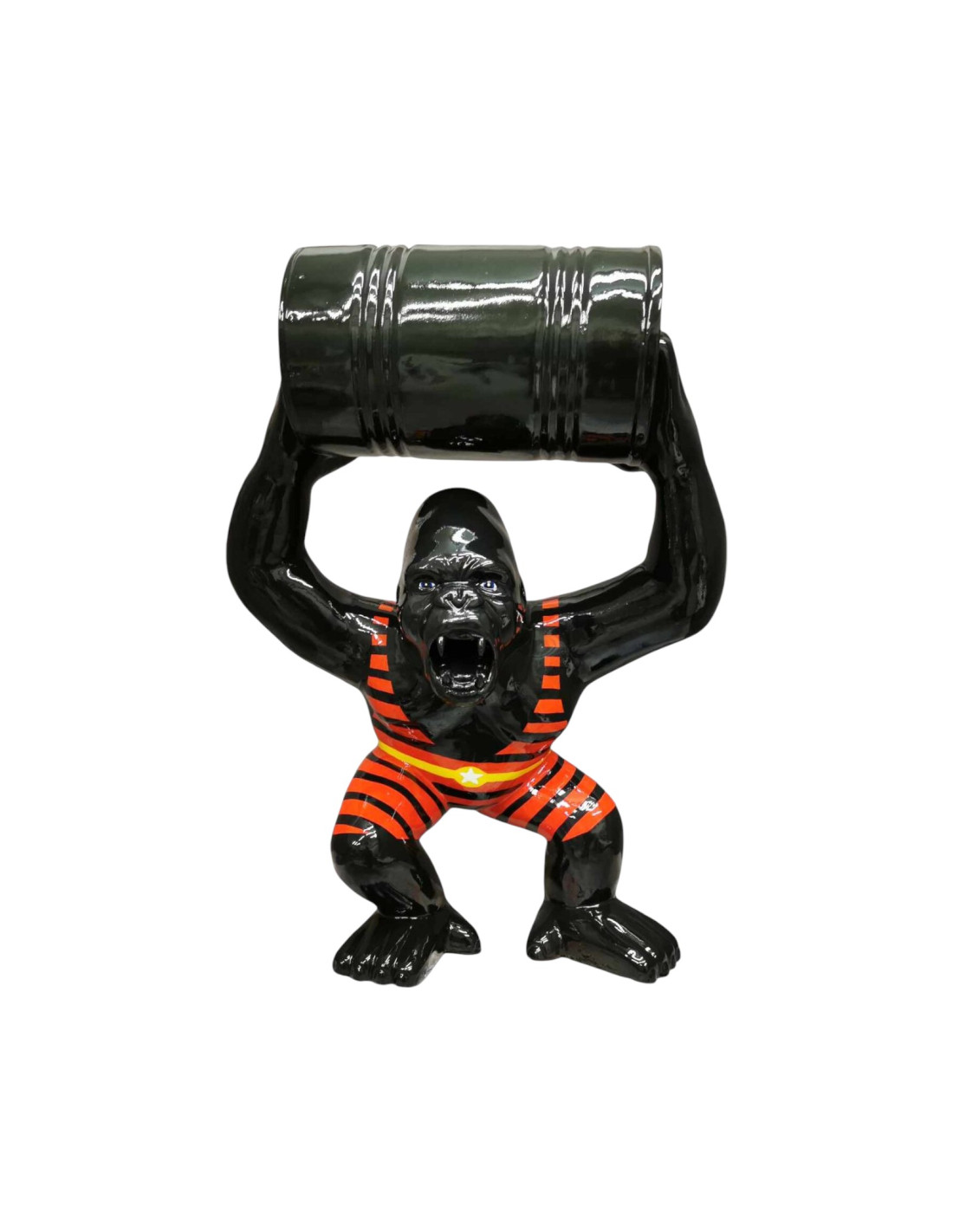 Figura Goryl z beczką Pop-Art czarny w czerwone pasy wysoki połysk żywica