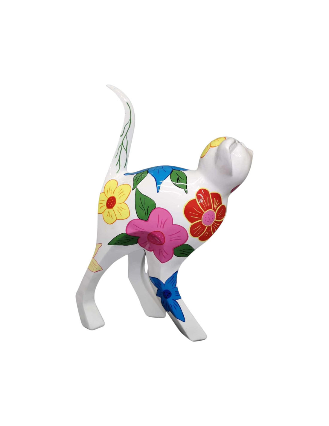 Figura kota w estetyce Pop-Art Floral z motywem kolorowych kwiatów, inspirowana nurtem Flower Power, wykonana z żywicy w wysokim połysku, doda radosnej energii każdemu nowoczesnemu wnętrzu – od salonu, przez sypialnię, po kreatywne biuro.