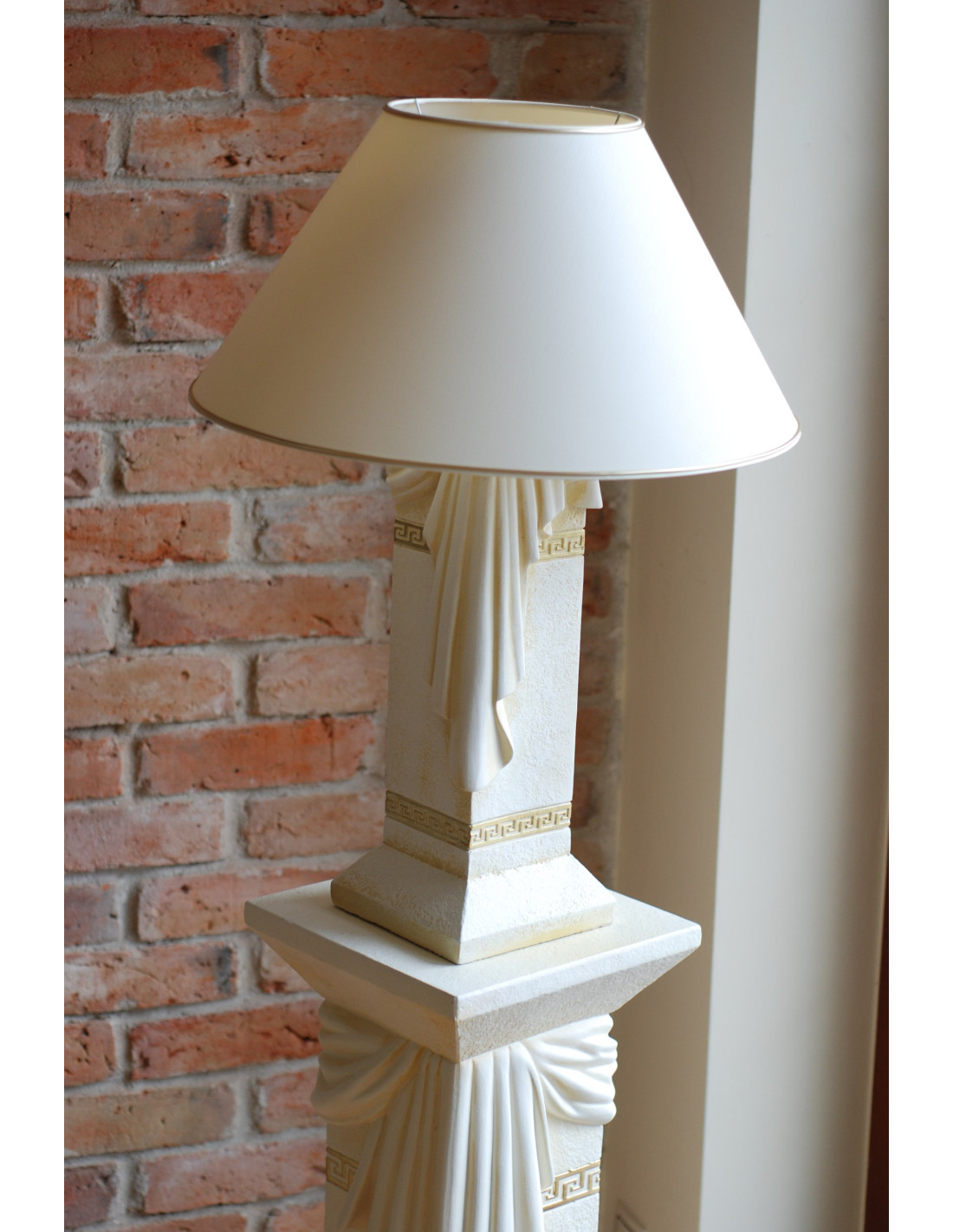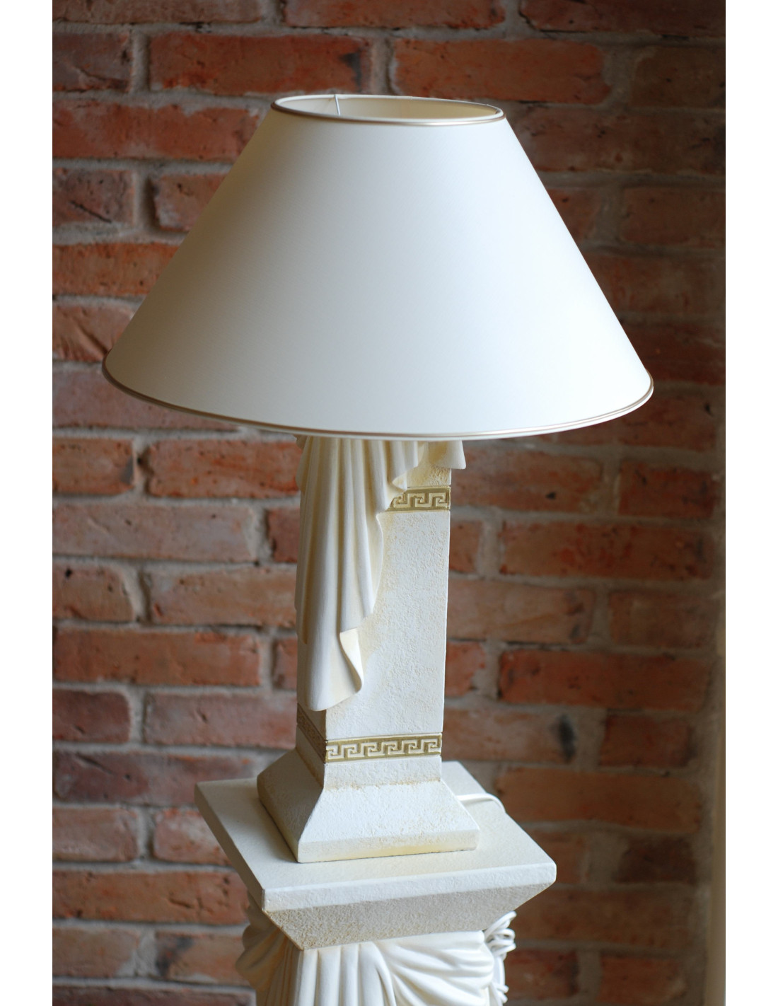 Illuminate your space with the timeless elegance of this classically inspired table lamp. Its base is a true work of art, sculpted to resemble an antique column adorned with graceful draperies in a soft white finish. A delicate touch of gold adds a hint of luxury, while the simple, round lampshade perfectly complements the ornate base and casts a warm, inviting glow. Meticulously crafted from high-quality resin, this lamp combines functional lighting with sophisticated sculptural appeal. It is a perfect accent piece for a side table, console, or bar, adding a touch of ancient grace to any setting.